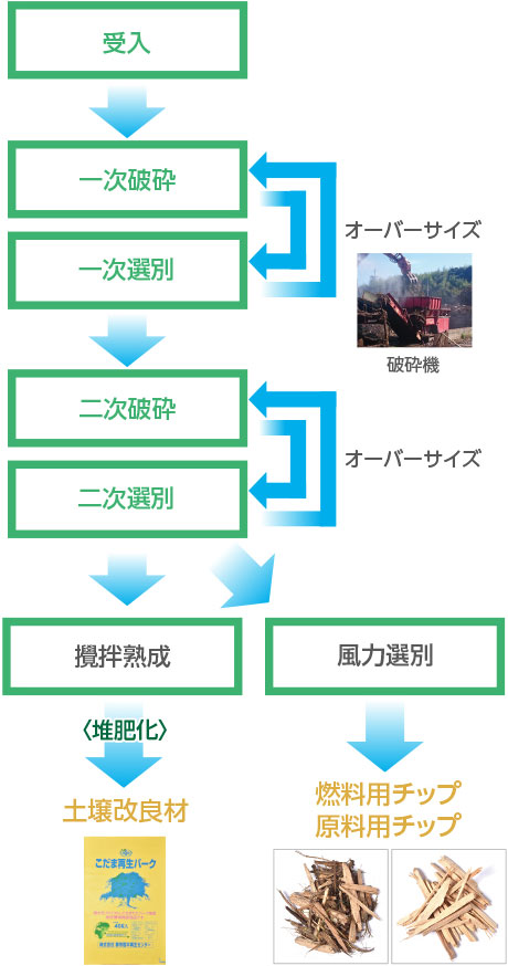 近畿圏から広く排出された木質廃棄物や山林未利用材を性状に応じ資源化しております。