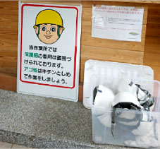 工場内での事故防止のため、お客様にはヘルメットの完全着用をお願いしています。
