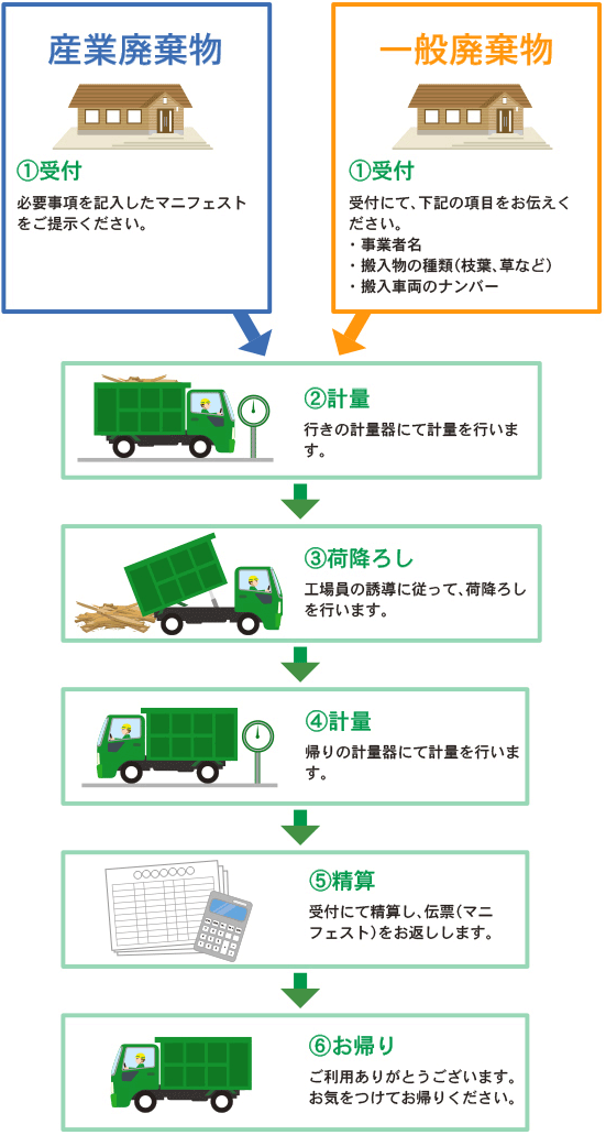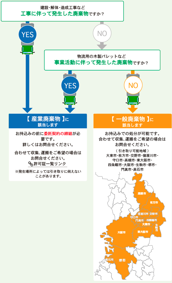 お持ち込みいただいた木くずが【産業廃棄物】か【一般廃棄物】により、受付時の手続きが異なります。判断については、以下のチャートをご参照下さい。